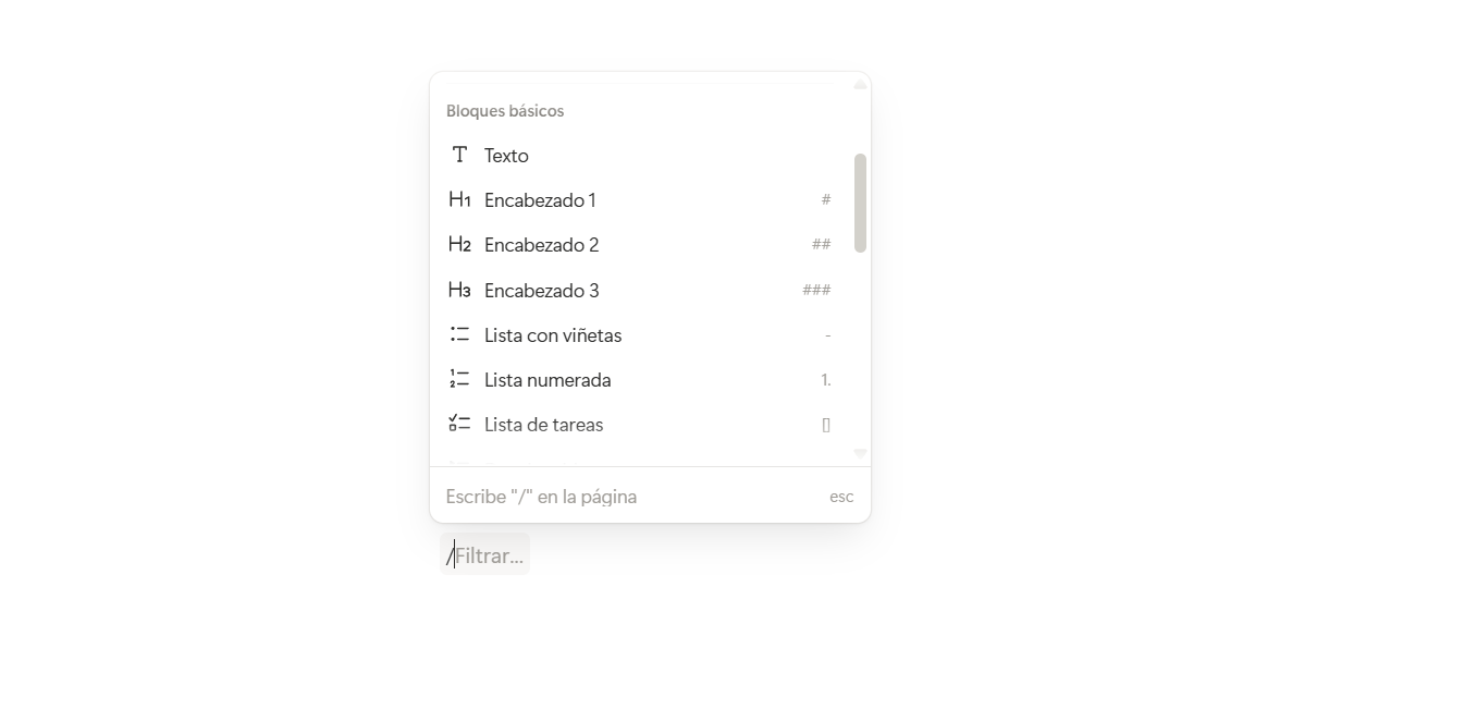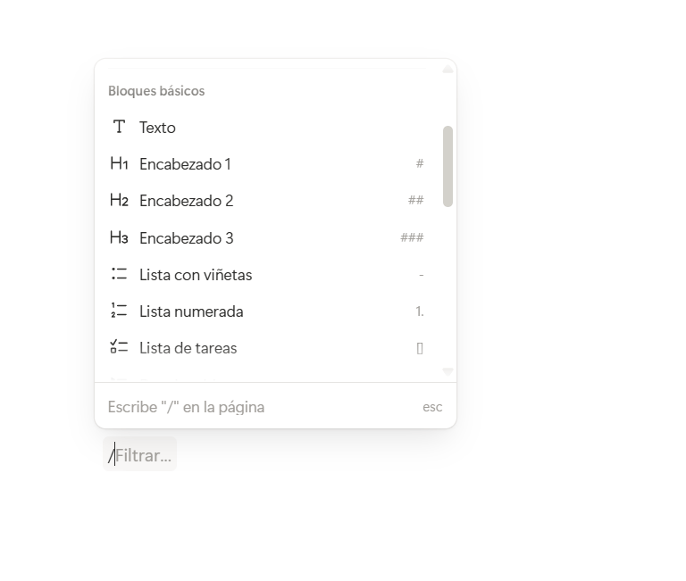 Tip: Escribe “/” en cualquier lugar y verás a continuación un menú desplegable donde encontrarás los tipos de bloques que hay y puedes usar.